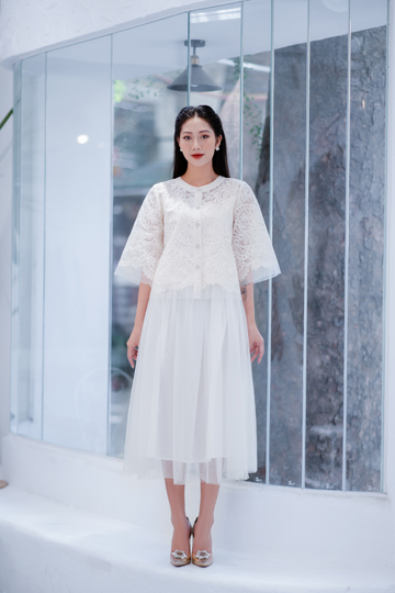 ✔ ÁO & CHÂN VÁY làm từ chất liệu vải tơ dệt ánh kim nhẹ mát, sang trọng, thân thiện với da.